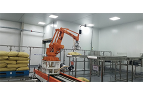 機(jī)器人在該項(xiàng)工作的應(yīng)用,極大的減少了工人勞動強(qiáng)度,增加了設(shè)備可靠性、穩(wěn)定性。通過更換不同的夾具,使其適用不同產(chǎn)品的卸垛/碼垛需求,增加了設(shè)備靈活性。